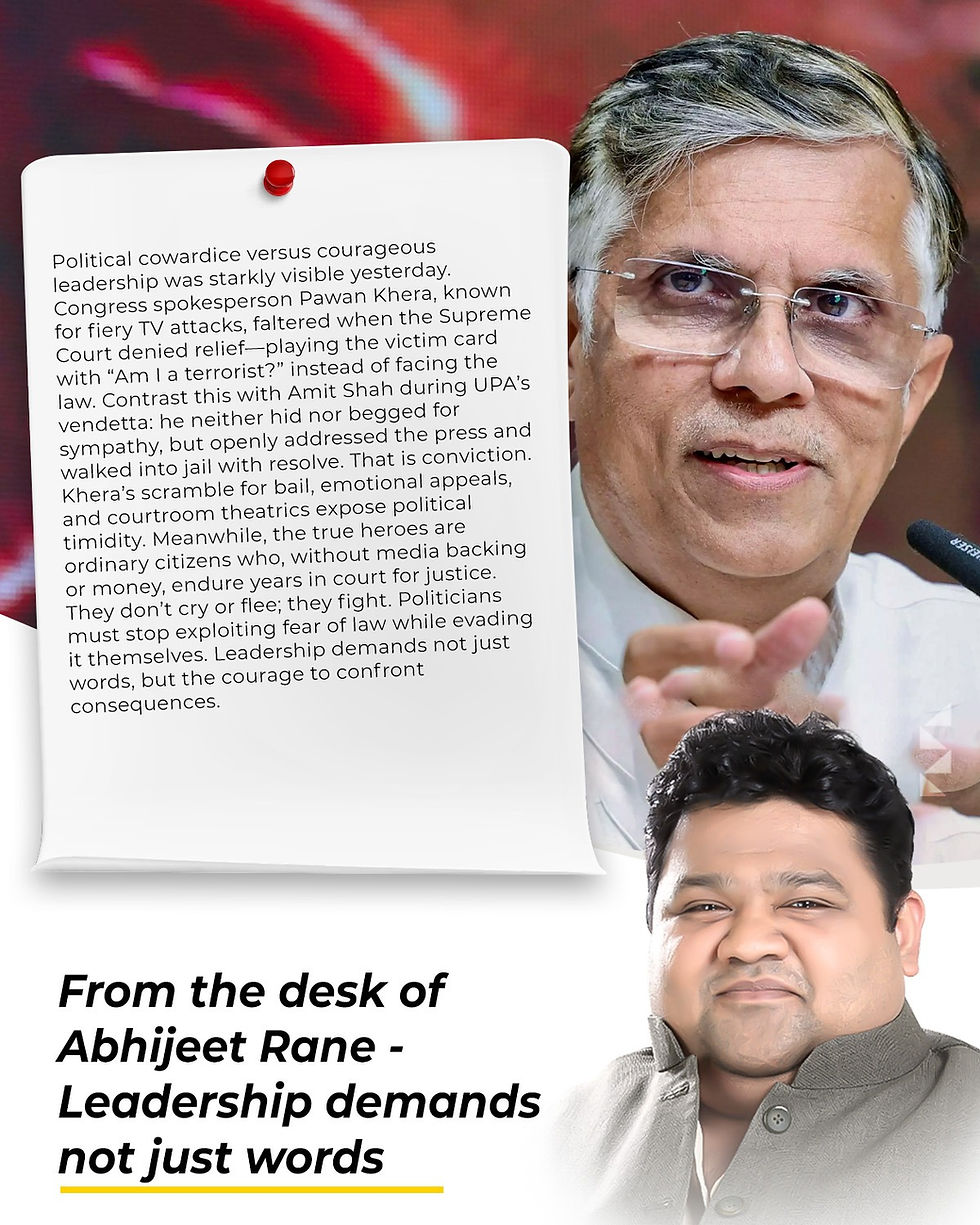 Political cowardice versus courageous leadership was starkly visible yesterday. Congress spokesperson Pawan Khera, known for fiery TV attacks, faltered when the Supreme Court denied relief—playing the victim card with “Am I a terrorist?” instead of facing the law. Contrast this with Amit Shah during UPA’s vendetta: he neither hid nor begged for sympathy, but openly addressed the press and walked into jail with resolve. That is conviction. Khera’s scramble for bail, emotional appeals, and courtroom theatrics expose political timidity. Meanwhile, the true heroes are ordinary citizens who, without media backing or money, endure years in court for justice. They don’t cry or flee; they fight. Politicians must stop exploiting fear of law while evading it themselves. Leadership demands not just words, but the courage to confront consequences.