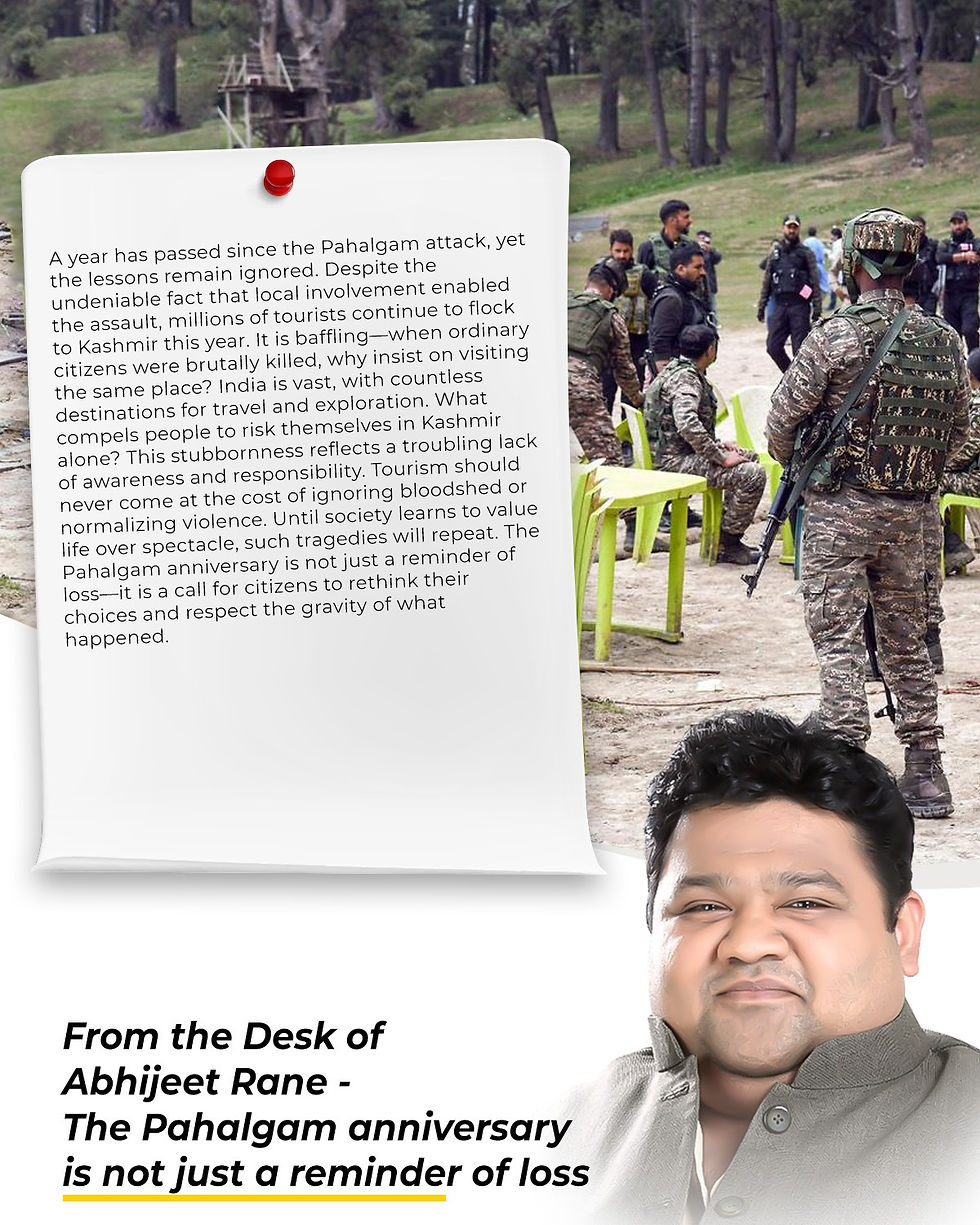 A year has passed since the Pahalgam attack, yet the lessons remain ignored. Despite the undeniable fact that local involvement enabled the assault, millions of tourists continue to flock to Kashmir this year. It is baffling—when ordinary citizens were brutally killed, why insist on visiting the same place? India is vast, with countless destinations for travel and exploration. What compels people to risk themselves in Kashmir alone? This stubbornness reflects a troubling lack of awareness and responsibility. Tourism should never come at the cost of ignoring bloodshed or normalizing violence. Until society learns to value life over spectacle, such tragedies will repeat. The Pahalgam anniversary is not just a reminder of loss—it is a call for citizens to rethink their choices and respect the gravity of what happened.