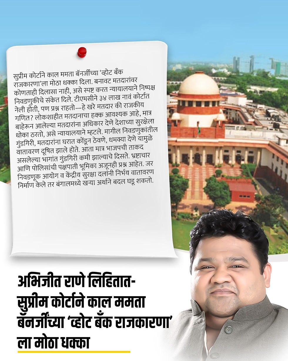 सुप्रीम कोर्टाने काल ममता बॅनर्जींच्या ‘व्होट बँक राजकारणा’ला मोठा धक्का दिला. बनावट मतदारांवर कोणताही दिलासा नाही, असे स्पष्ट करत न्यायालयाने निष्पक्ष निवडणुकीचे संकेत दिले. टीएमसीने ३४ लाख नावं कोर्टात नेली होती, पण प्रश्न राहतो—हे खरे मतदार की राजकीय गणित? लोकशाहीत मतदानाचा हक्क आवश्यक आहे, मात्र बाहेरून आलेल्या मतदारांना अधिकार देणे देशाच्या सुरक्षेला धोका ठरतो, असे न्यायालयाने म्हटले. मागील निवडणुकांतील गुंडगिरी, मतदारांना घरात कोंडून ठेवणे, धमक्या देणे यामुळे वातावरण दूषित झाले होते. आता मात्र भाजपची ताकद असलेल्या भागांत गुंडगिरी कमी झाल्याचे दिसते. भ्रष्टाचार आणि पोलिसांची पक्षपाती भूमिका अजूनही प्रश्न आहेत. जर निवडणूक आयोग व केंद्रीय सुरक्षा दलांनी निर्भय वातावरण निर्माण केले तर बंगालमध्ये खऱ्या अर्थाने बदल घडू शकतो.